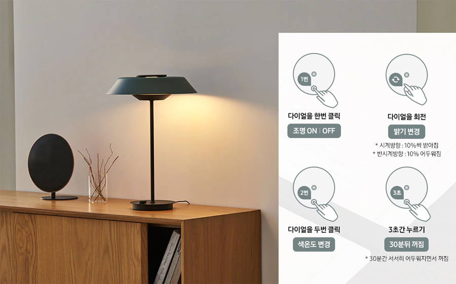 바디에 부착된 다이얼을 통해 조명의 켜짐/꺼짐, 10%단위의 밝기 조절, 색온도 변경, 30분 타이머가 가능하며, 빛이 헤드 부분 아래 쉐이드를 통과하여 쉐이드 윗면으로 비추어주기 때문에 하나의 조명으로 아래뿐만 아니라 위쪽까지 밝힐 수 있다.