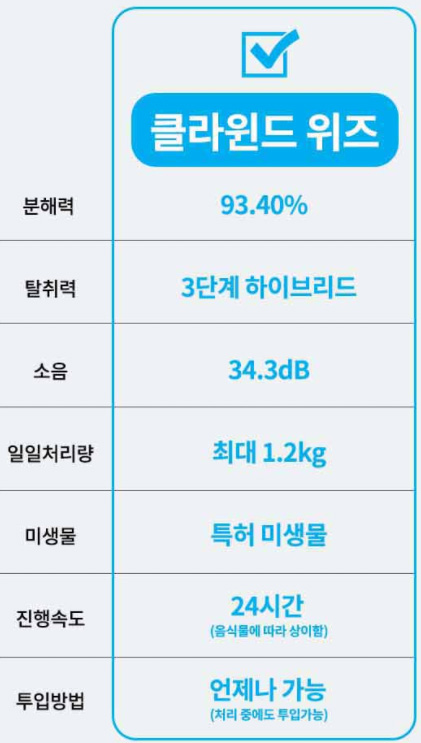위 표는 캐리어 클라윈드 위즈 음식물처리기의 스펙표이다. 먼저 분해력은 타사의 음식물처리기의 평균 수치가 90% 수준이기 때문에 상대적으로 뛰어나다고 볼 수 있으나, 처리속도 24시간, 일일처리량 최대 1.2kg은 평균 수준이며, 소음 34.3dB도 평균 수준으로 볼 수 있으나 30dB 미만 제품도 여럿 있는 만큼 소음은 다소 아쉽다. 참고로 '특허' 미생물 역시 캐리어뿐만 아니라 다른 여러 제조사에서도 사용하고 있기 때문에 우위 요소로 보기는 어렵다.